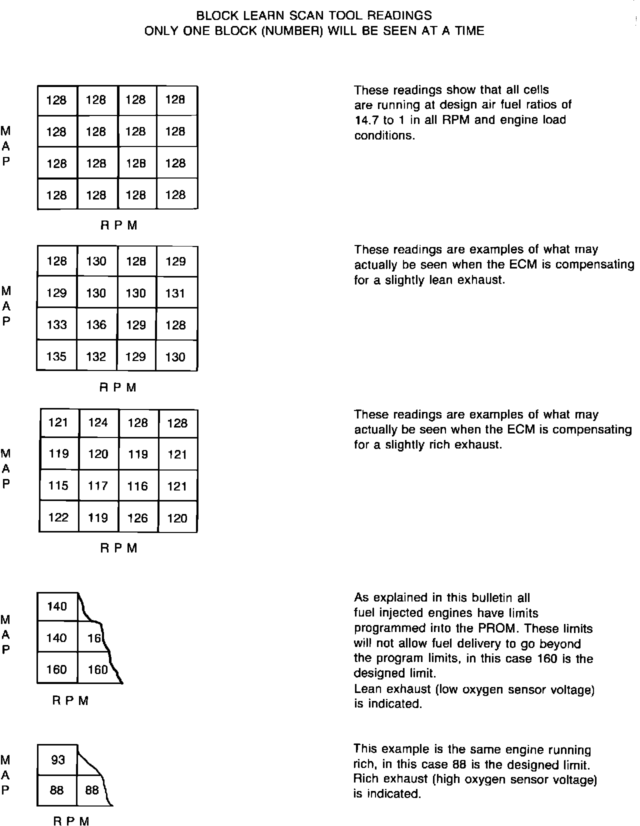 Block learn is a portion of ECM memory used to adjust fuel delivery across all operating conditions of the engine. The ECM reserves memory locations for various load conditions of the engine specified by MAP and RPM (see Figure 1). Each location represents a "block", or specific operating condition of the engine. Within a block the ECM stores a number that represents fuel adjustment (similar to the integrator).