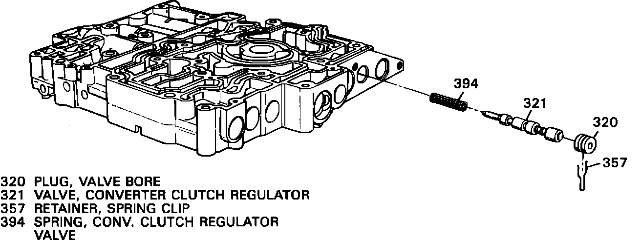 All 1986 production on transaxle model codes AAH, ACH, ADH, AFH, AMH, ARH (see Figure 1 for Transaxle Model Identification) are built with the converter clutch regulator valve spring eliminated. Due to calibration and fluid passage changes, the spring is no longer required (Figure 2, Item 394).