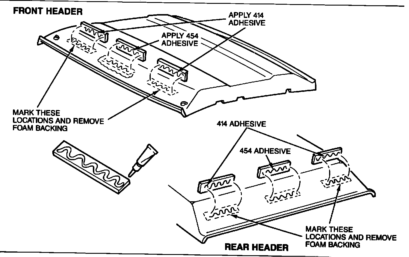 A. Apply 454 adhesive (minimum amount) to the new center Velero (R) strips and install in the prepared smooth locations on the front and rear of the headliner.