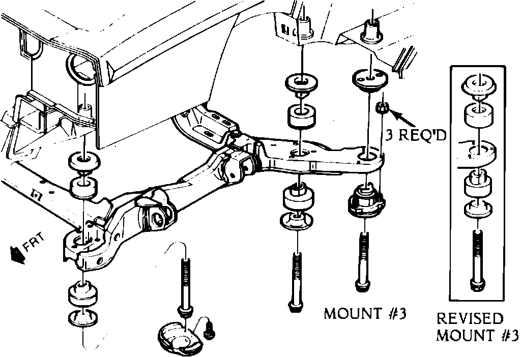 Some 1987 De Villes and Fleetwoods with standard suspensions built before VIN 285541 may experience a squawk or squeak noise from the floorboard or front suspension area on acceleration from a stop and/or during braking. This condition may be caused by movement between the #3 cradle mount spacer and the body. This condition can be repaired by installing a revised cradle mount and spacer assembly in the #3 position. Both right and left side #3 mounts must be replaced.