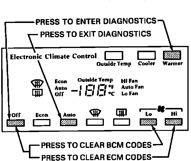 To exit diagnostic mode, depress Auto button on CCP or turn ignition Off for ten seconds until the temperature setting is displayed. Stored codes will not be cleared.