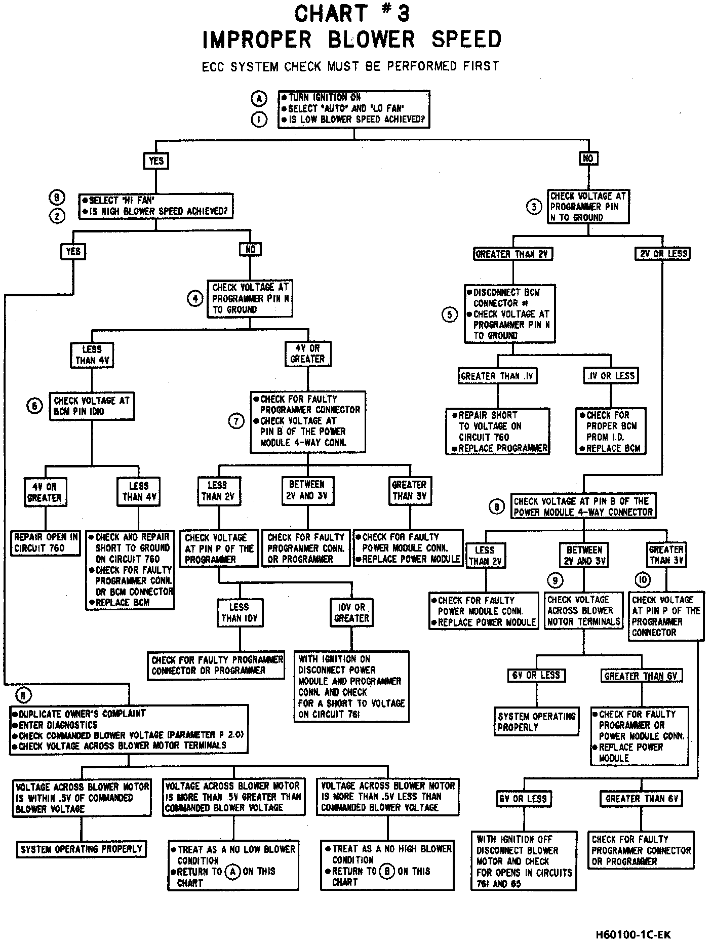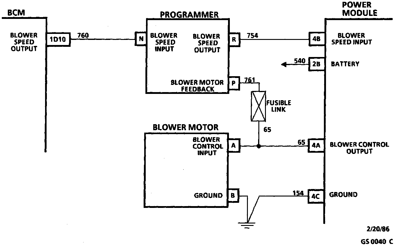 Based on a signal sent from the Body Control Module (BCM), the programmer sends a variable amperage signal to the power module which is then amplified and sent to the blower motor. The programmer monitors the blower voltage so that the signal can be adjusted to achieve the desired blower motor speed.