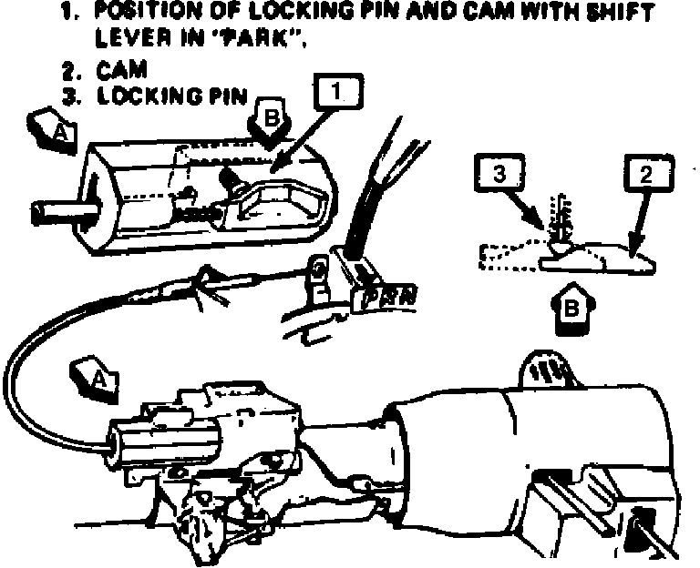 6. On models with floor shift, insert screwdriver into slot in ignition switch inhibitor, depress park-lock cable latch and disconnect cable from inhibitor, Fig. 3. Ignition switch must be in ``Run'' position. Do not attempt to disconnect park-lock cable with switch in any other position.