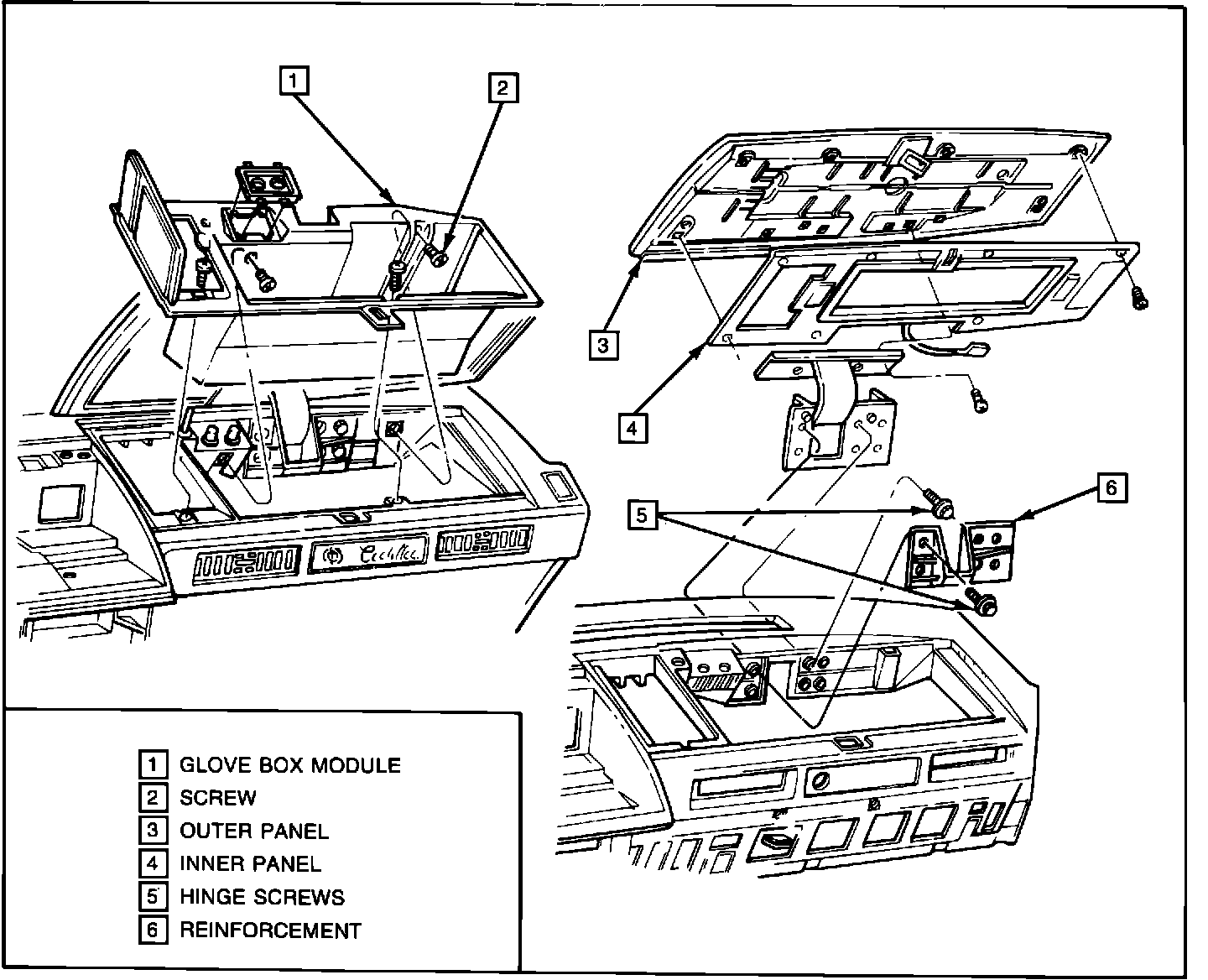2. Remove four hinge screws (5) and remove glove box door assembly (3 and 4).