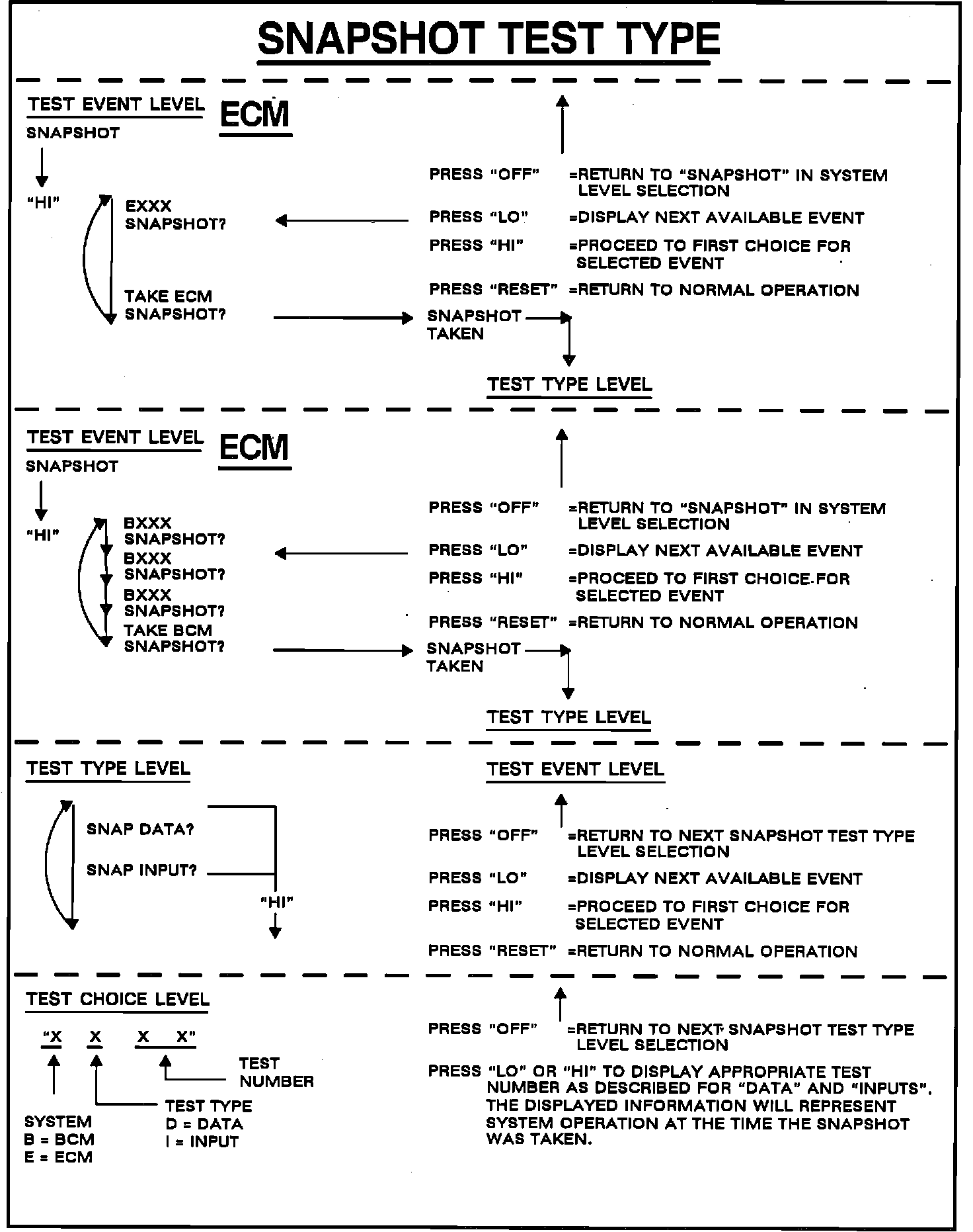 With the message displayed on the panel as outlined above, depress the Hi button, then depress the Lo button until ``Snapshot?'' is displayed. Selection of the ``Snapshot'' test type will result in a ``Snapshot Taken'' display with selected system name preceding it.