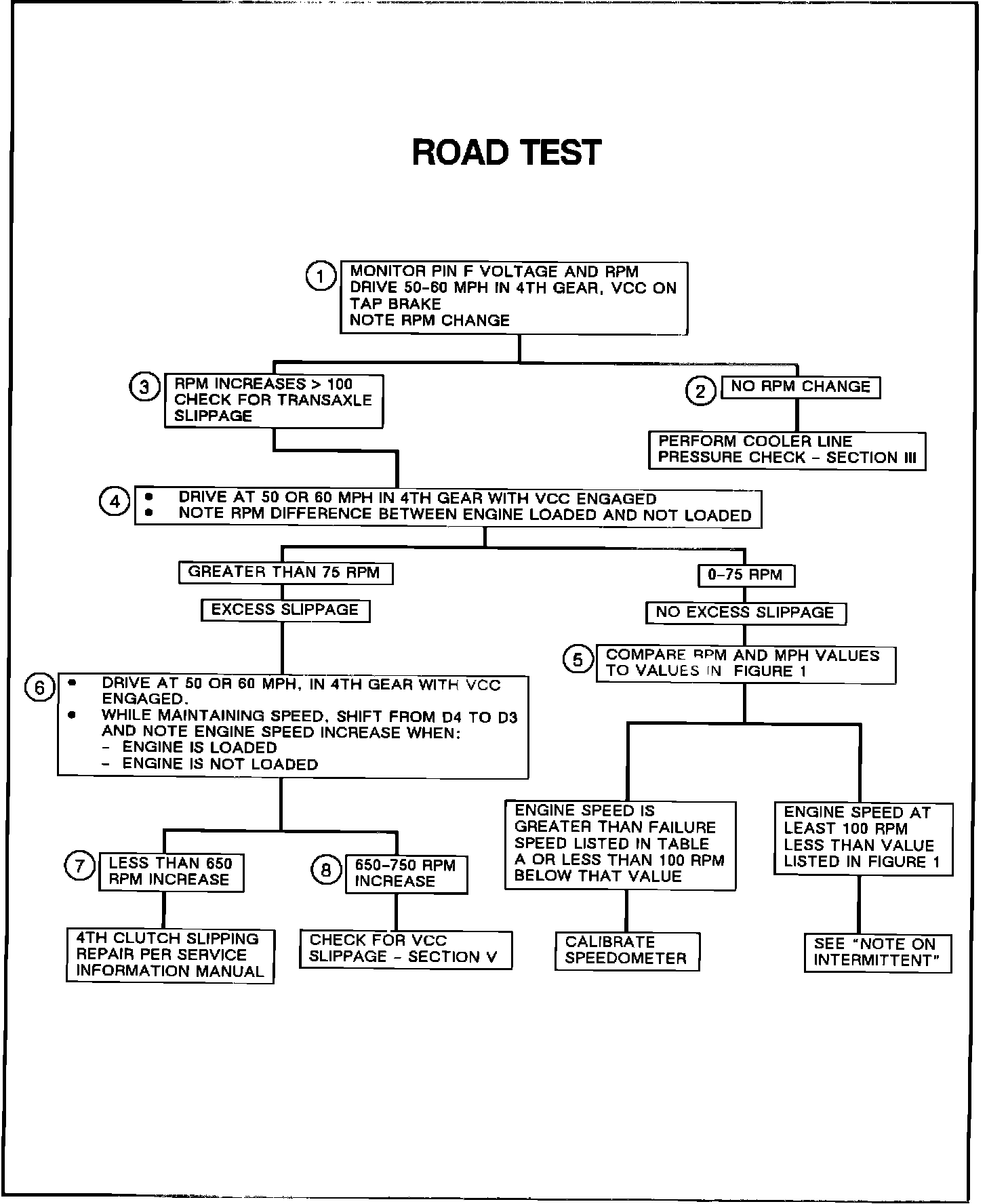 ROAD TEST, indicates the VCC is not applying because there is no rpm change when the VCC is commanded on and off.Monitoring the transaxle outlet cooler line pressure while the VCC is commanded on and off will determine if the VCC apply valve is shifting.