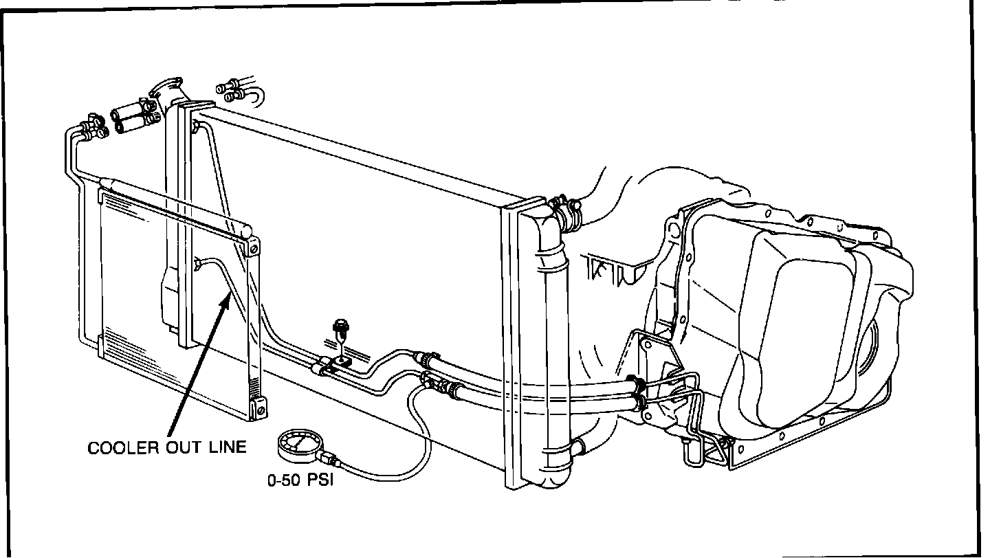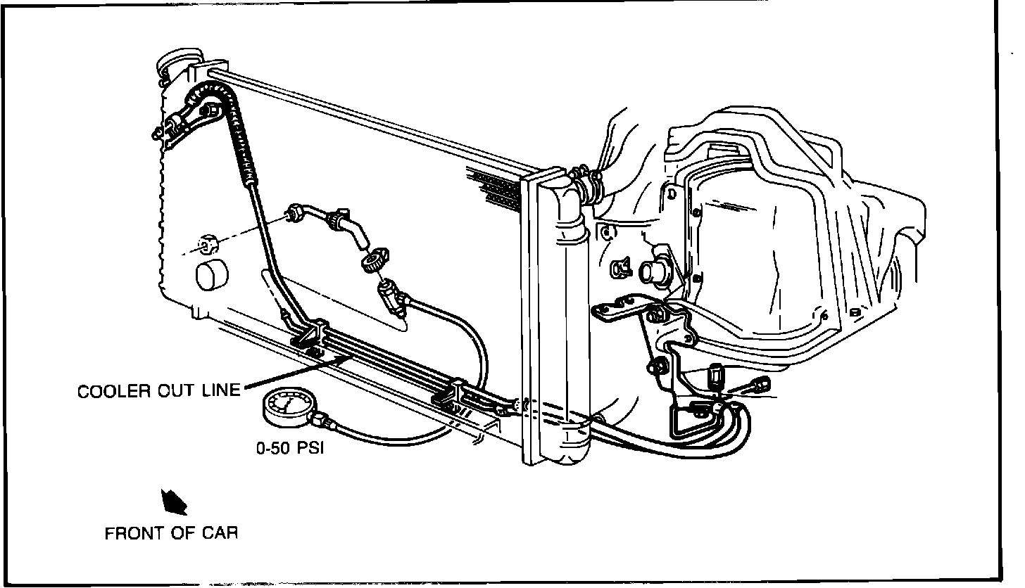 1. Install a 0-50 psi pressure gauge into the transaxle outlet line to the cooler. This line has a black check ball fitting at the transaxle and runs to the bottom fitting at the radiator, refer to Figure 5 for DeVilles and Fleetwoods, or Figure 6 for Eldorados and Sevilles.