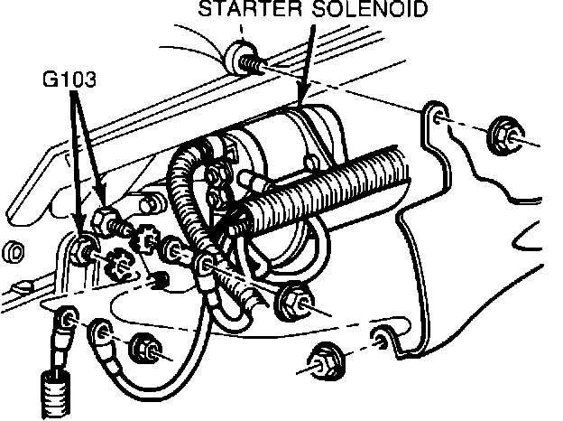 - Codes B127 and/or B128 set. If any of these conditions are experienced, ground connection G103 should be inspected (see Figure 1). Ground connection G103 consists of two stud connections located near the engine starter. These studs should be secure to the engine and ground terminals should be fastened to the studs with star washers and nuts torqued to 20 N-m (15 ft.lbs.).