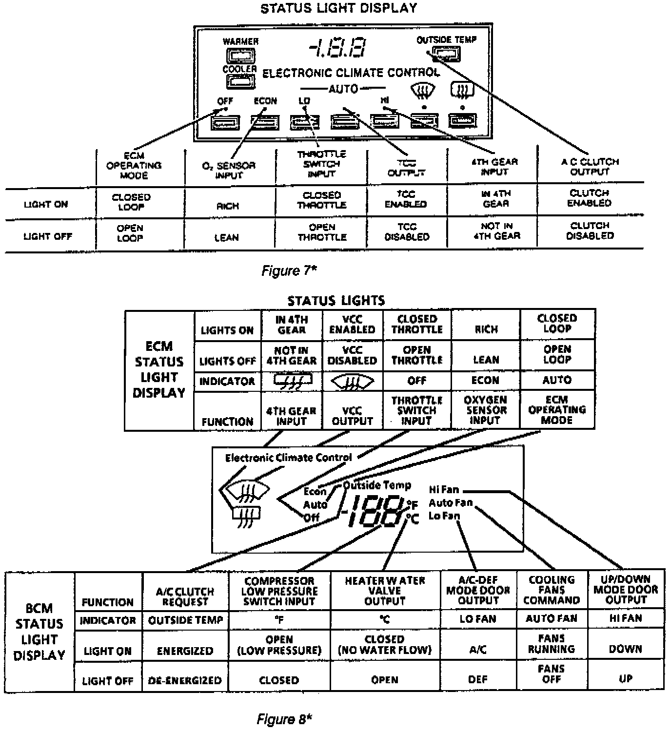Status LightsYou can use the status lights on the climate control panel to check various switches, sensors and computer functions. Figure 7 shows the early and figure 8 shows the late type status displays. Through these displays you can check for computer ground to the T.C.C., 4th gear signal to the computer, etc.