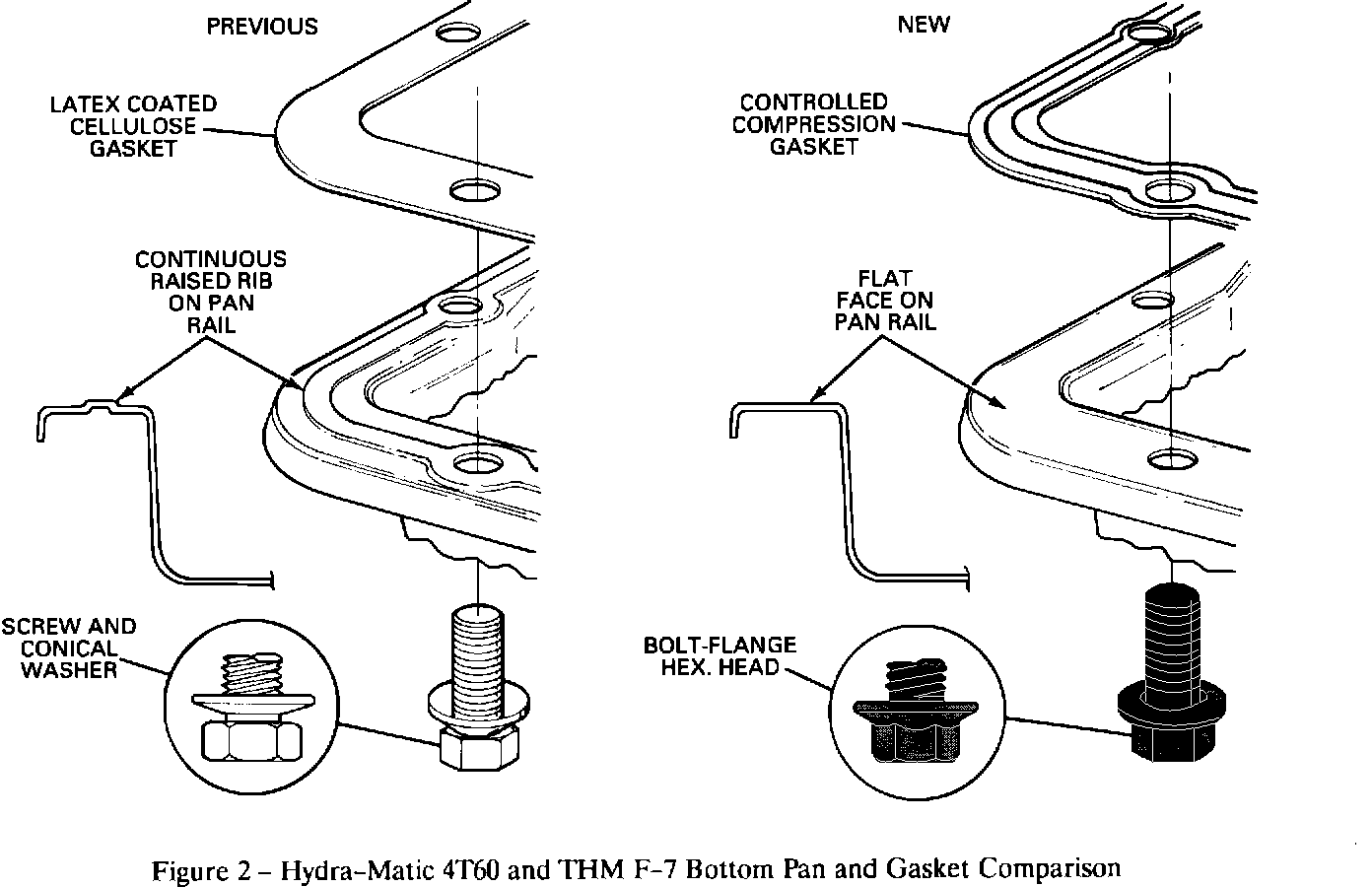 This new controlled compression bottom pan gasket can be used on all previous Hydra-Matic 4T60 and F-7 transaxles when used with the new bottom pan and flanged hex head bolt. The old style conical washer screw can be used with the new bottom pan and controlled compression gasket, but the new flanged hex head bolt cannot be used on the old style bottom pan and gasket combination. Refer to Figure 2.