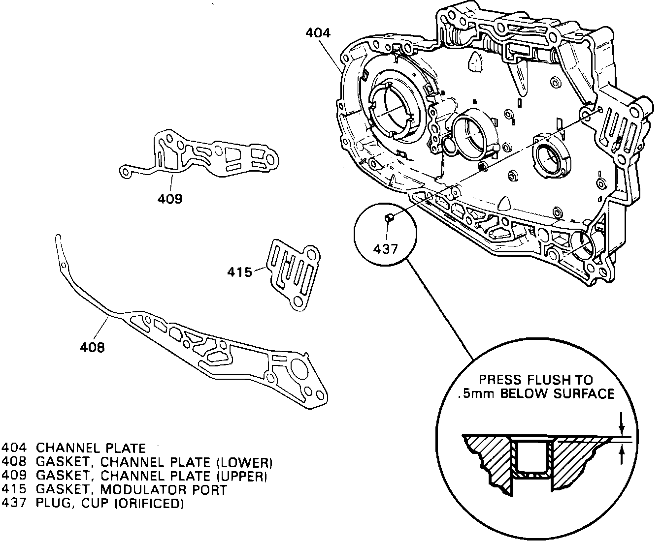 To repair this condition, remove the transaxle and channel plate and insert the cup plug from the service package listed below (See Figure 1). Press the cup plug flush to .5 mm below the surface.
