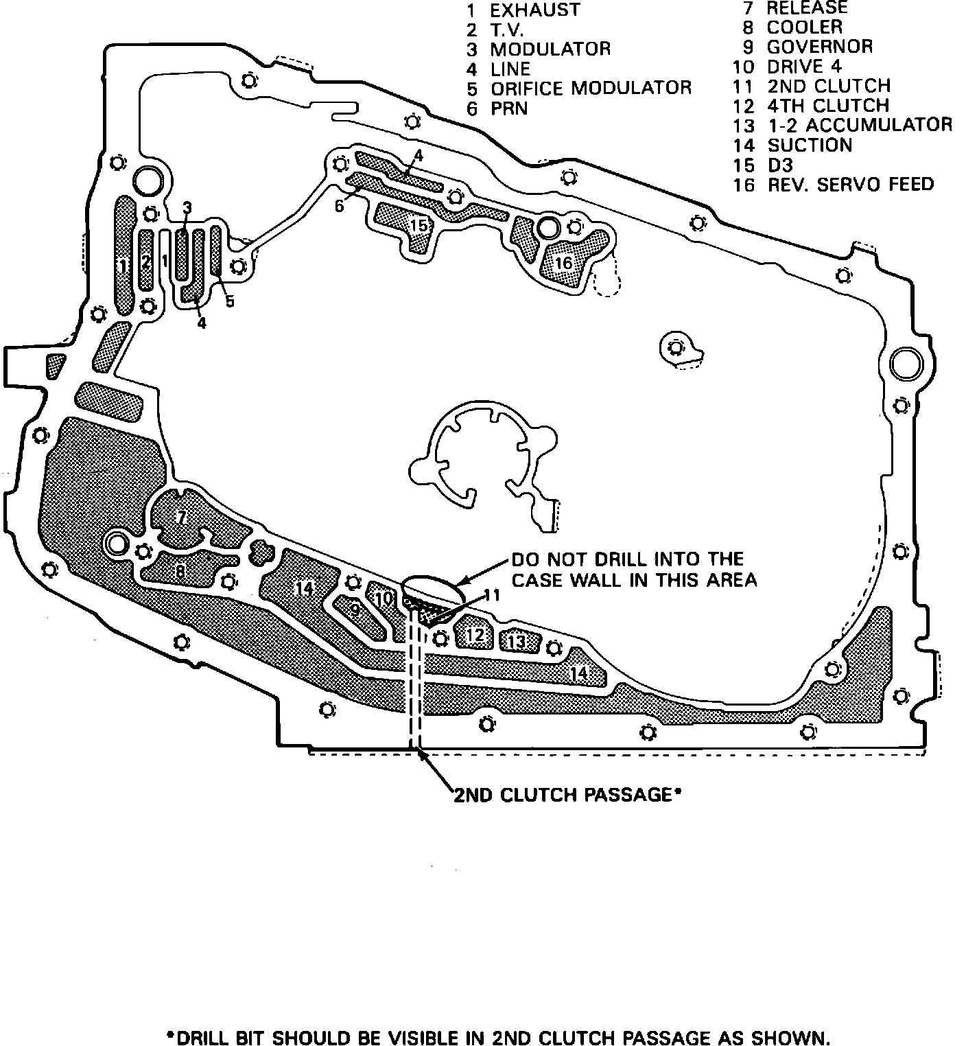 NOTE: DRILLING TOO DEEP INTO THE 2nd CLUTCH PASSAGE WILL RESULT IN DAMAGE TO THE CASE.