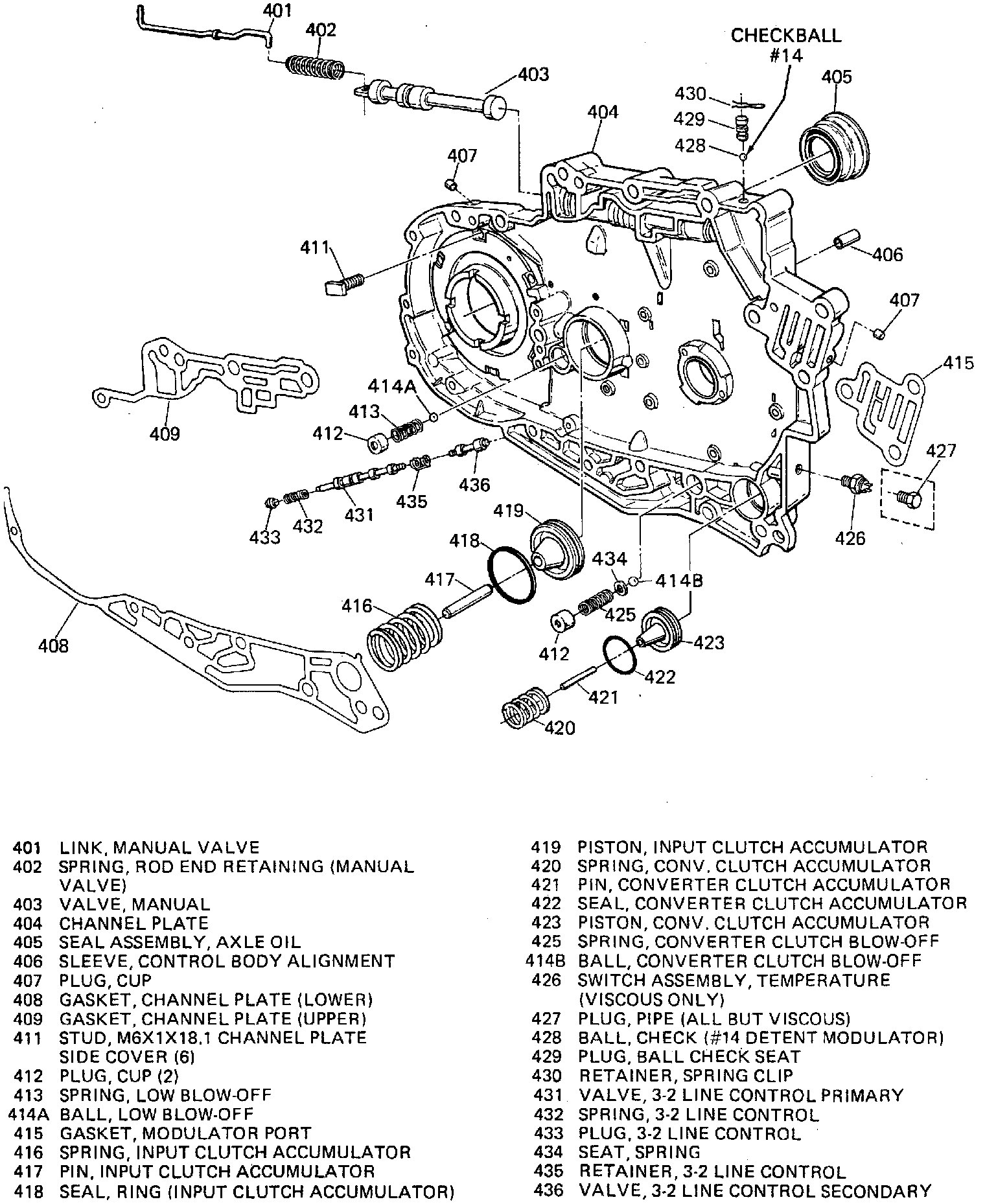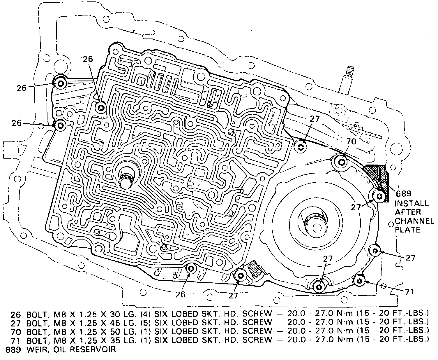 147. Install manual valve and link, and secure with spring or clip, then position oil weir between channel plate and case.