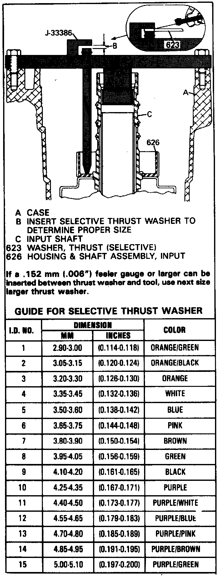 c. Insert selective thrust washer into opening "B," check fit using feeler gauges, and select proper thrust washer by referring to the chart.