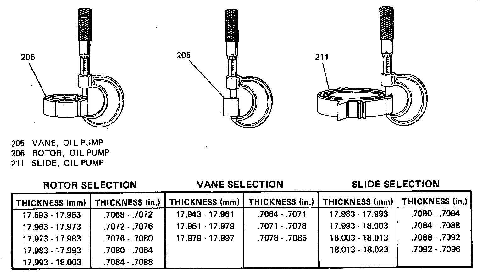 b. Select properly sized replacement as shown in chart. Failure to select properly sized replacements for the rotor, vane or slider will cause damage to transaxle.