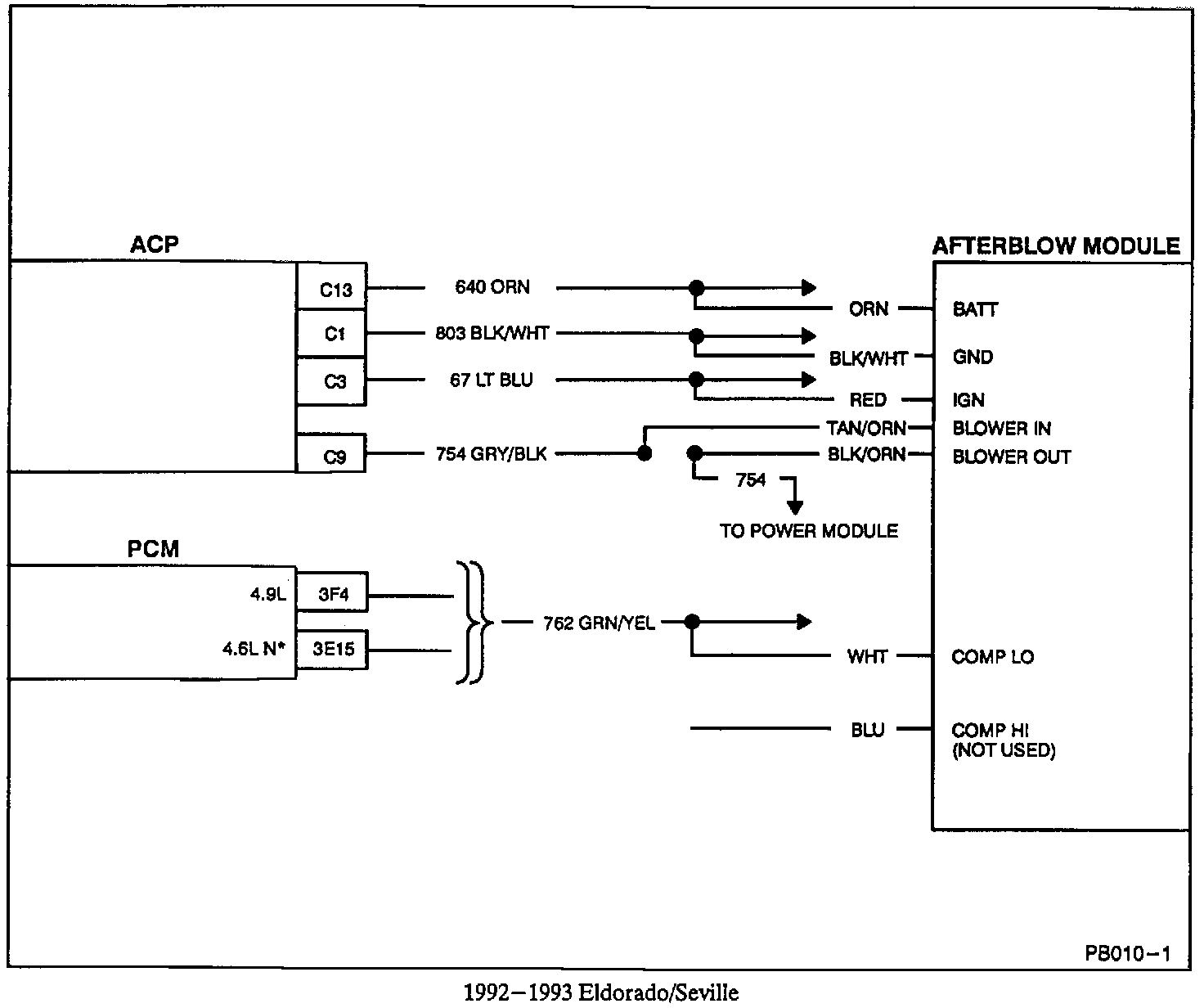 The installation of the afterblow module as outlined in the following steps will turn the blower motor on approximately 50 minutes after the vehicle ignition is turned off if the compressor was engaged for more than four minutes during the last ignition cycle. During the first 50 minutes after the vehicle ignition is turned off, the evaporator will accumulate water condensate on the core. Cycling the blower motor at high speed for approximately five minutes will force the water to be shed from the core and to drain from the evaporator case. This procedure is used to prevent the recurrence of the odor. Be sure to advise the owner of this change in operation.