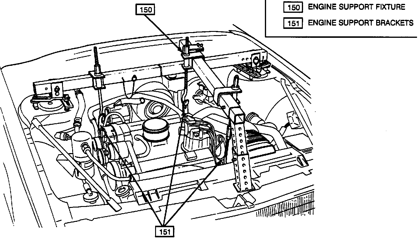 ^ In order to obtain maximum clearance for cover removal, the engine and transaxle assembly needs to be tilted downward at the front end. This is accomplished by positioning the left (driver's side) rear support rod of J 28467 until it extends approximately six inches above the T-nut and left front support rod is lowered until the top is flush with the top of the nut.