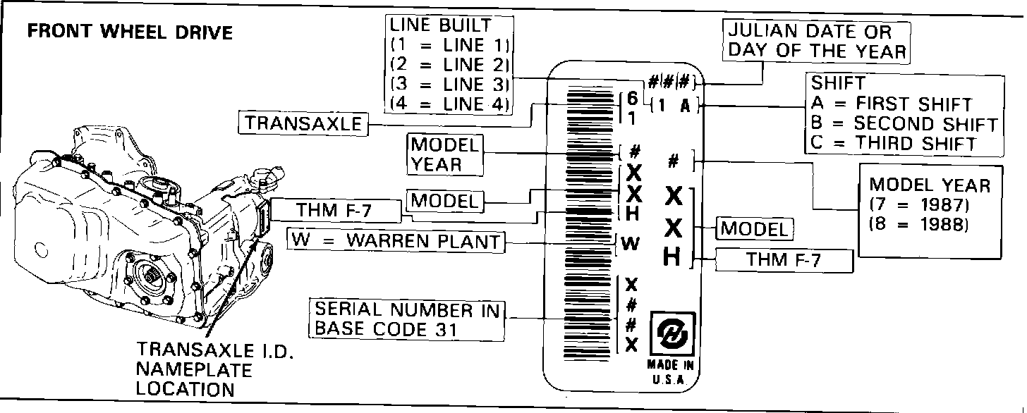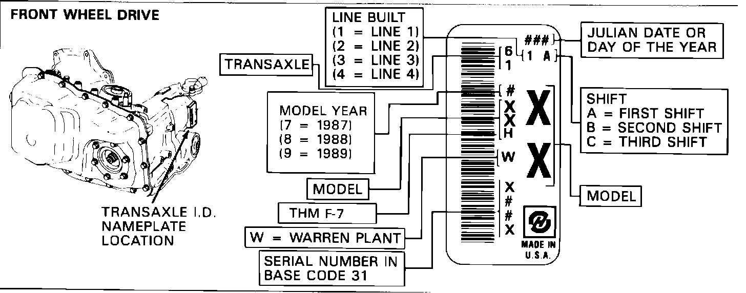 This bulletin outlines requirements regarding (A) Transaxle identification, Figures 1 and 2; (B) SRTA model chart, Figure 3; (C) THM F-7 fluid fill information, Figure 4; (D) SRTA processing procedures, Figures 5 and 6; and (E) ECM-PROM compatibility information, Figure 7.