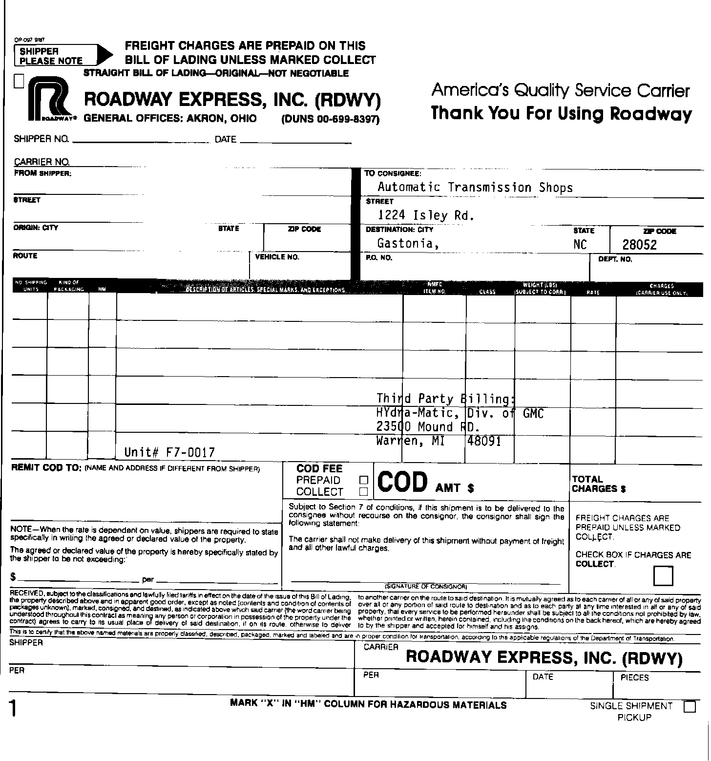Also, the dealership is required to contact Roadway Express, Inc. for delivery of the core to the remanufacturing site. The forms are similar to the THM 440-T4 SRTA Program except for those shown in Figures 5 and 6.