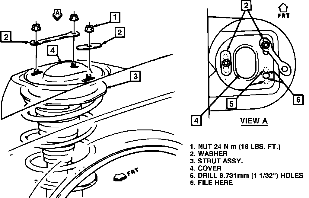 4. Drill 11/32 inch holes at front and rear of oval strut mounting hole and file excess metal, Fig. 1.