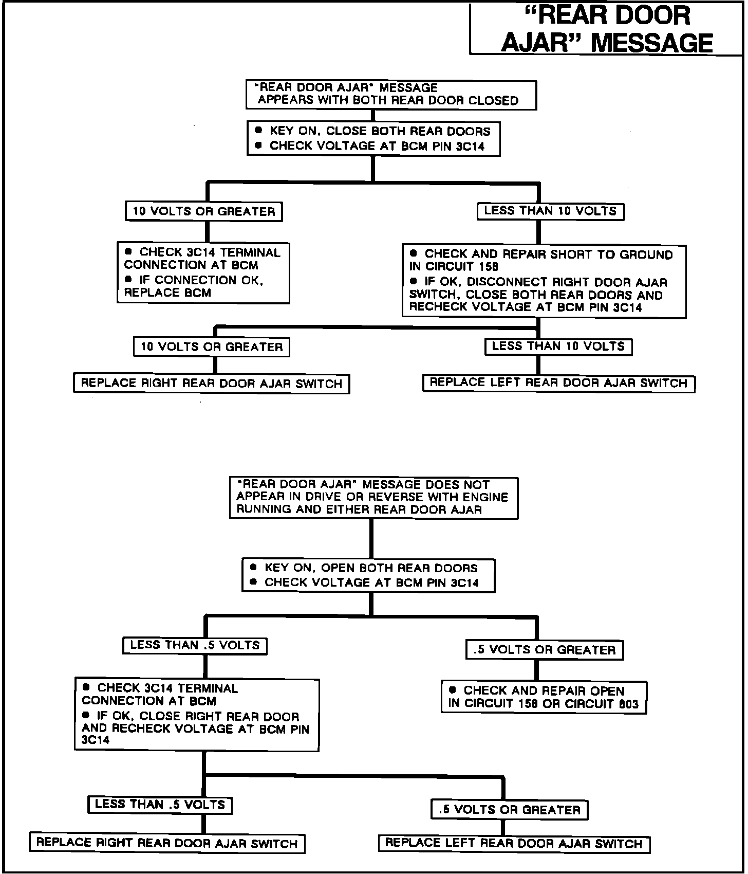 Display the "Rear Door Ajar" message on the CCDIC. The BCM provides system voltage to the rear door ajar circuit, and the left hand and right hand rear door ajar switches provide two separate paths to ground. The BCM internally monitors the voltage level at pin 3C14. When the rear door ajar circuit is open the BCM will detect system voltage, but if one or both switches provide a path to ground (either rear door open), the BCM will detect the circuit has been grounded. Once the BCM detects that all failure conditions have been met, it will send the "Rear Door Ajar" message to the CCDIC.