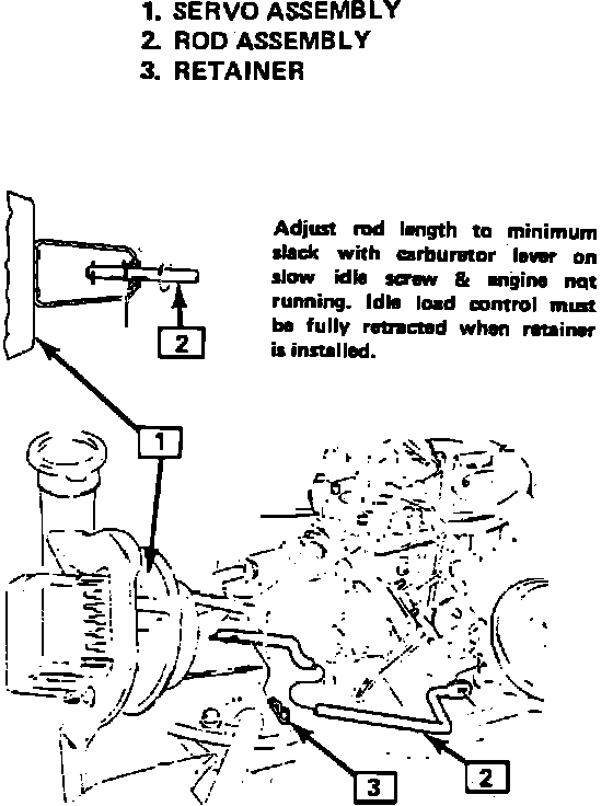 On carbureted models, a rod assembly is used to control cruise control speed. Adjustment is made with engine Off, carburetor lever on slow idle screw and Idle Load Control (ILC), fully retracted. Adjust rod length to obtain the least amount of slack, Fig. 2.