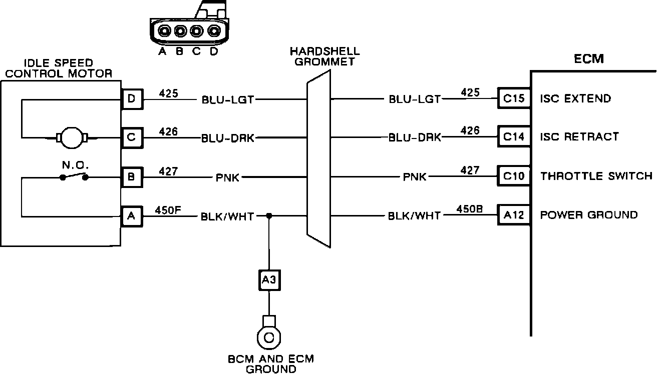 The ECM sends a 5 volts signal to pin "B" of the ISC motor on CKT 427. When the throttle linkage rests on the ISC plunger, the throttle switch contacts close, shorting ISC pin "B" to pin "A" (CKT 450 ground). The 5 volt signal from the ECM is grounded at closed throttle, resulting in 0 volts at ECM pin C1O. When the throttle is opened, the throttle switch opens pin "B" CKT 427, resulting in 5 volts at ECM pin C10.
