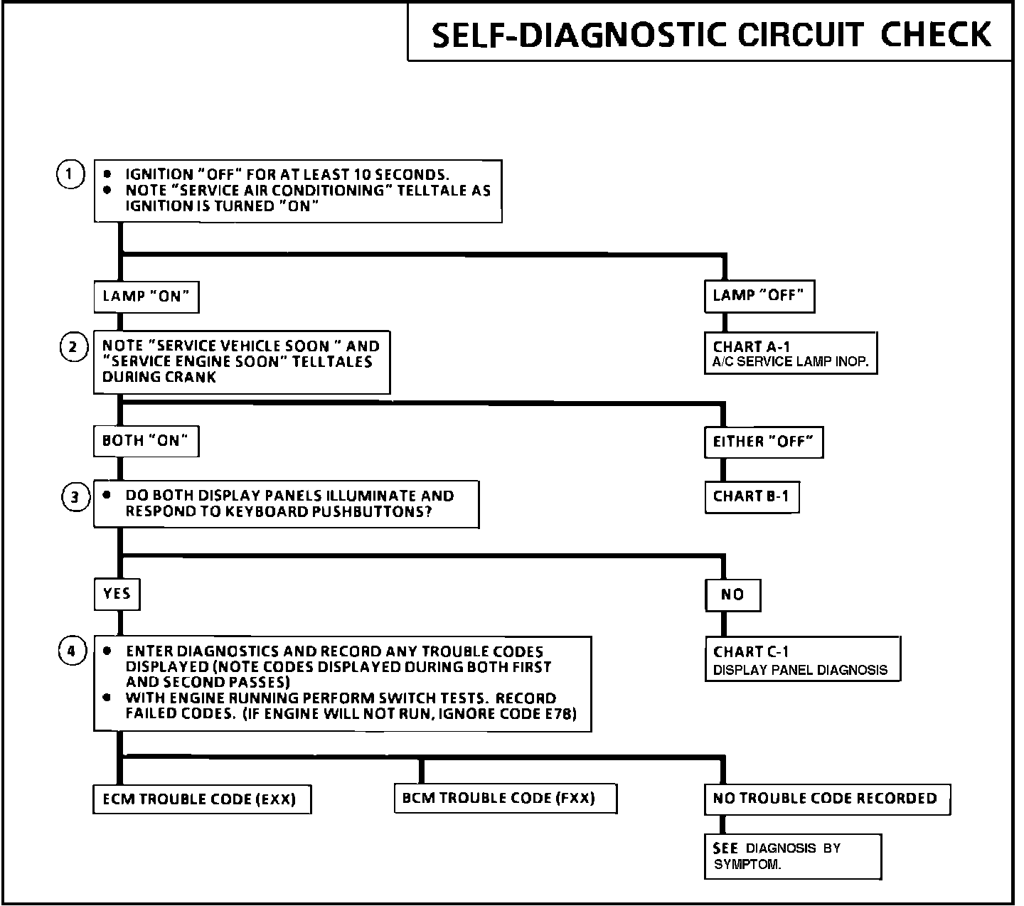 The SELF-DIAGNOSTIC CIRCUIT CHECK is an organized approach for identifying a problem caused by the on-car computer-controlled electronics. Understanding this chart and using it correctly will reduce diagnosis time and prevent the unnecessary replacement of parts. Refer to HOW TO ENTER DIAGNOSTIC MODE.