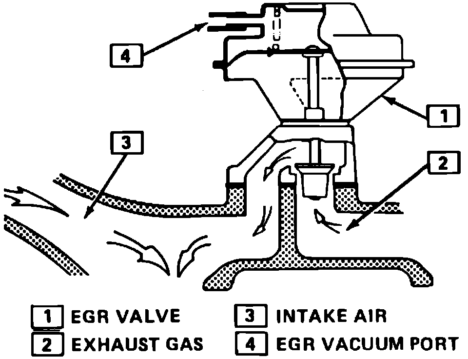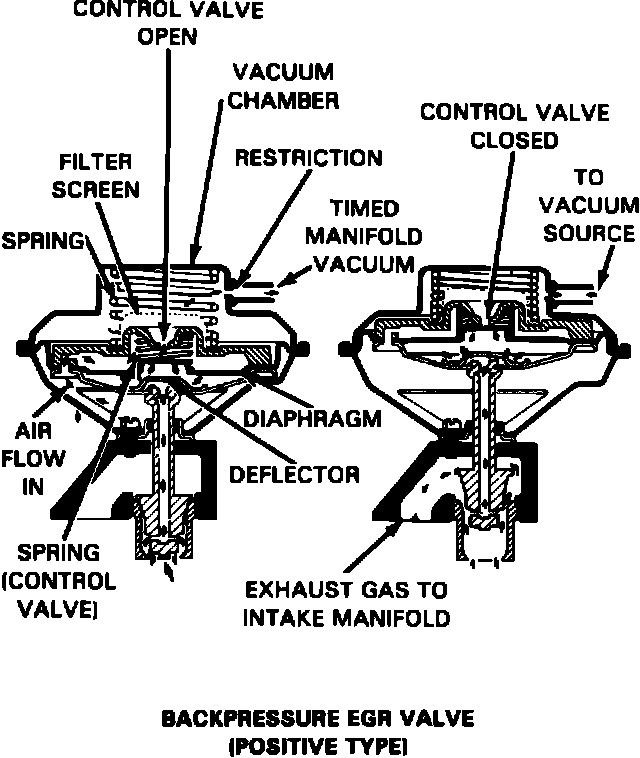 This vehicle use a positive backpressure EGR valve. A positive backpressure EGR valve requires exhaust backpressure (proportional to engine flow) to open and allow exhaust gas to flow into the intake manifold. The exhaust gas then moves with the air/fuel mixture into the combustion chamber. If too much exhaust gas enters, the engine might misfire. For this reason, very little exhaust gas is allowed to pass through the valve, especially at idle. Careful diagnosis of the system is important so that outside conditions (such as an exhaust tube connected to the vehicle causing reduced exhaust backpressure) will not lead to misdiagnosis.