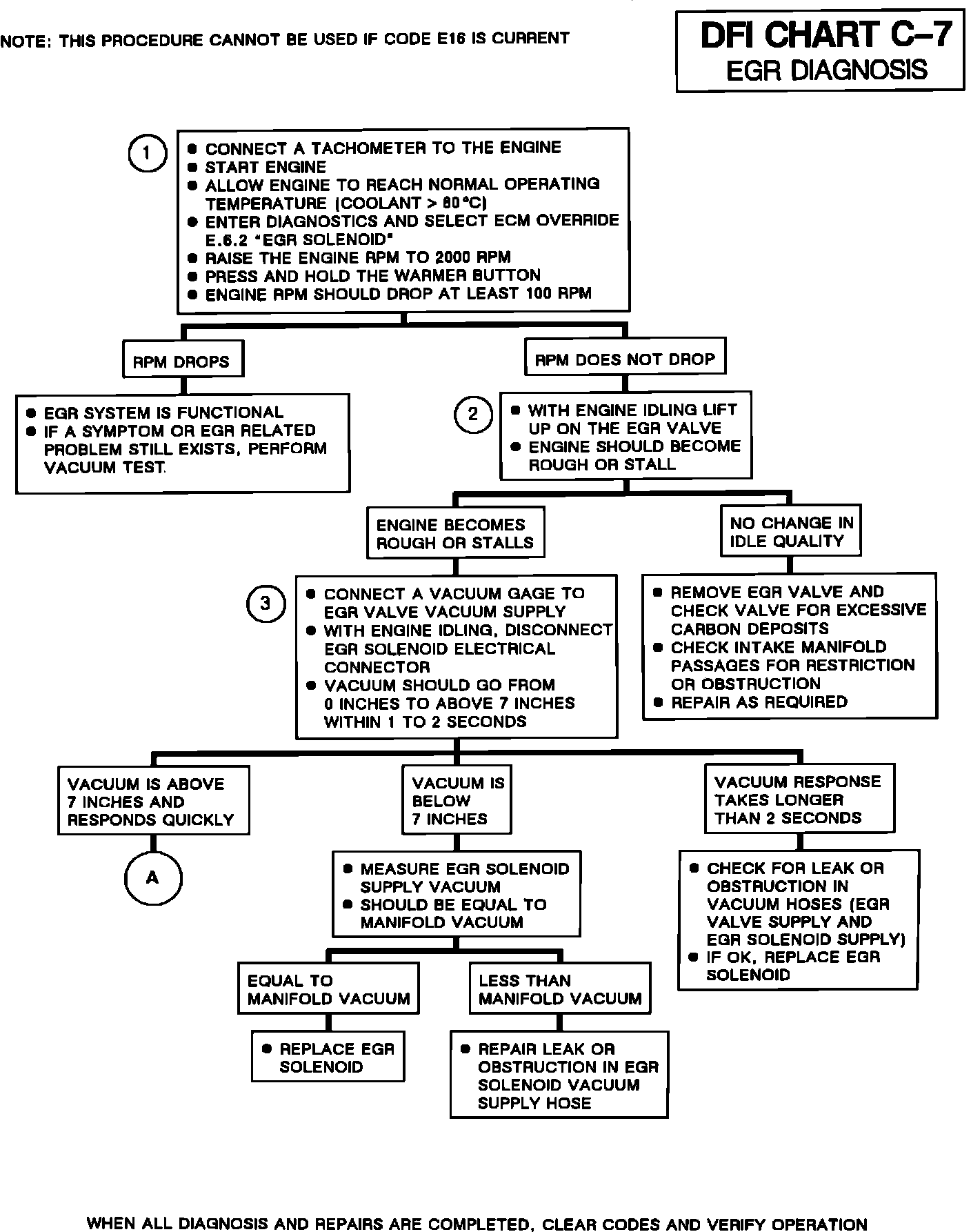 ^ Connect a vacuum gauge to the EGR valve vacuum supply. There should be no vacuum with the engine idling. If there is, follow chart C-7 above. With the gauge hooked to the EGR valve vacuum supply, disconnect the EGR solenoid connector. There should be more than 8 inches of vacuum available. If not, repair leak or obstruction in EGR valve vacuum hose.