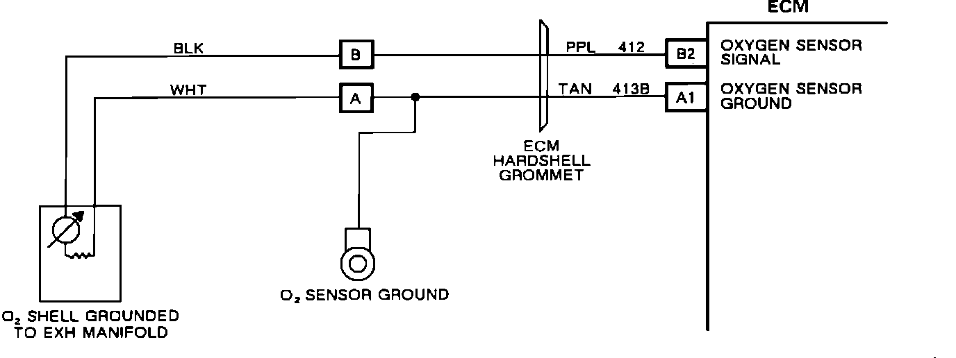 1. The ECM compares voltage on CKT 412 to the ground voltage on CKT 413. It is essential that the oxygen sensor ground and ECM ground on pin A-1 show good continuity.
