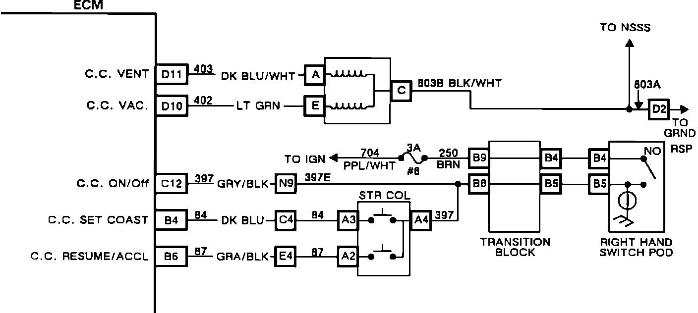 The ECM Cruise "Set/Coast" circuit is a normally open switch that provides a 12 volt "Set/Coast" signal to the ECM on terminal B4 when depressed. When the cruise dash switch is in the "ON" position, the cruise dash switch provides 12 volts to the cruise steering column switch on pin A4, CKT 397. When the Set/Coast button is depressed, the steering column switch pin A4 is connected to pin E3, CKT 84, providing the ECM with a 12 volt Set/Coast input on terminal B4.