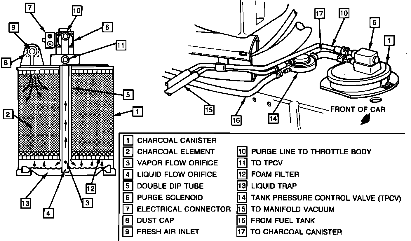 The EECS uses an inverted function charcoal canister. A double dip tube extends down the center of the canister to a liquid trap at the canister base. Fuel vapor from the tank enters a port at the top of the canister. Vapor (and any liquid droplets) travels down the dip tube between the inner dip tube and the outer tube wall. Any liquid present is trapped in the lower liquid well, away from the charcoal element. Fuel vapor is stored in the activated carbon element until purged.