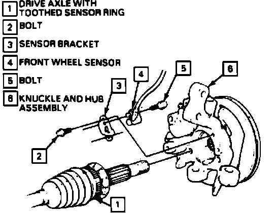 b. If wheel sensor is reused, adjust air gap to .028 inches on 6000 models. On all models except 6000 the wheel sensor is automatically adjusted when installed. New sensors come equipped with a paper spacer which will properly gap the sensor when placed against speed sensor ring.