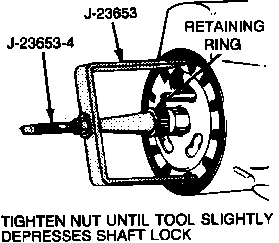 4. On all models, using lock plate compressing tool J-23653-A, compress lock plate and pry snap ring from shaft groove, Fig. 14. Slowly release lock plate compressor and remove tool and lock plate from shaft end.
