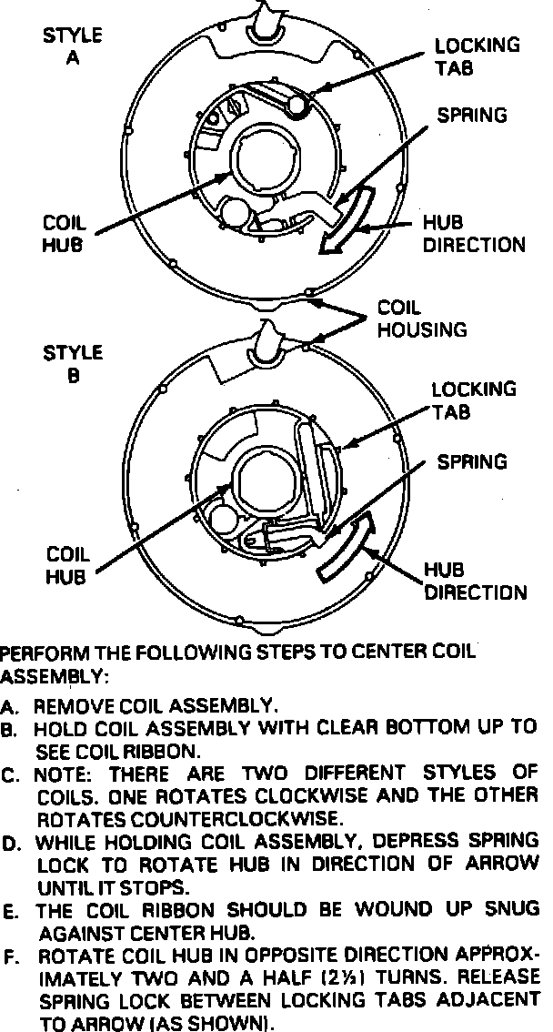 3. On models with inflatable restraint, remove coil assembly retaining ring, then the coil assembly from shaft. Allow coil assembly to hang freely.