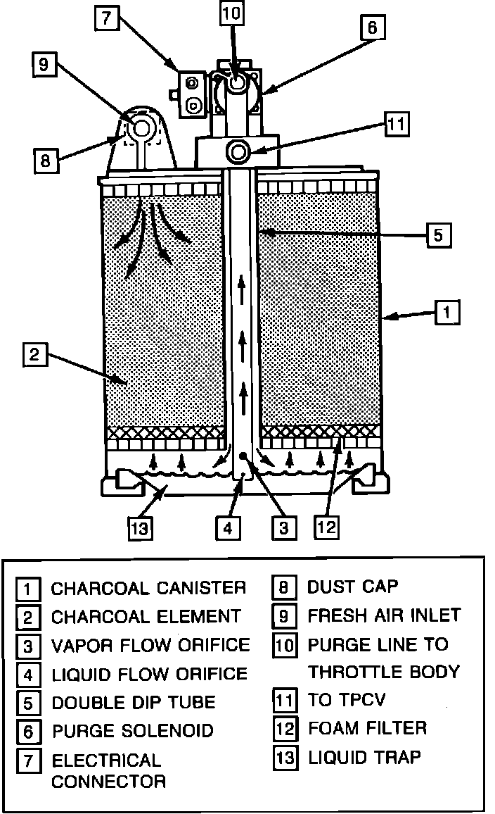 The EECS uses an inverted function charcoal canister. A double dip tube extends down the center of the canister to a liquid trap at the canister base. Fuel vapor from the tank enters a port at the top of the canister. Vapor (and any liquid droplets) travels down the dip tube between the inner dip tube and the outer tube wall. Any liquid present is trapped in the lower liquid well, away from the charcoal element. Fuel vapor is stored in the activated carbon element until purged.