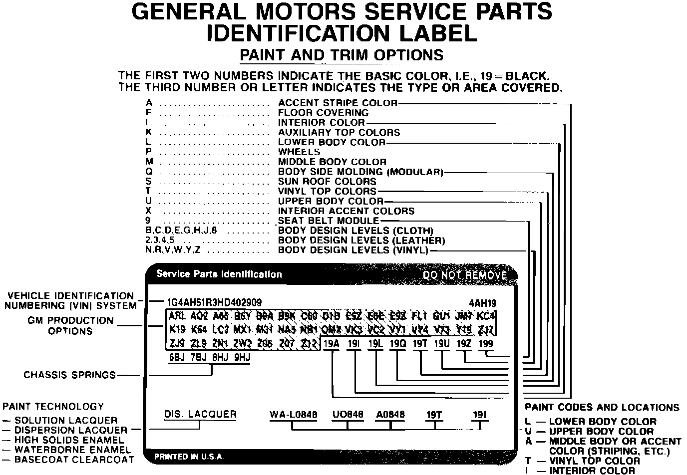 The Service Parts Identification (SPID) label illustrated in Figure 1 is located on the inside of the trunk panel or the spare tire cover. This label contains the paint codes needed to identify the paint materials for field repairs. Note this label identifies the paint code along with the WA# for that paint code. It is equally important to use this WA# along with the paint code to identify the correct repair materials. This is especially true for codes # 40 White and # 41 Black, where the WA# identifies the clearcoat repair material from the dispersion lacquer repair material. Care should be taken to transfer the SPID label or its information if the panel to which the label is affixed requires replacement. Replacement SPID labels are not available.