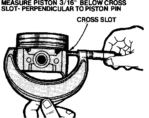 When measuring piston diameter, place micrometer 3/16 inch below cross slot or 3/8 inch below oil ring groove, Fig. 14. Cylinder liner diameter is measured two inches down from top of liner and perpendicular to the cylinder centerline. The difference between the two readings should be .0010-.0018 inch on 4.5L engines or .0004-.0020 inch on 4.9L engines. Cylinder bore out of round should not exceed .0008 inch. If any reading is not within specifications, the piston and cylinder liner must be replaced. No attempt should be made to rebore or hone the cylinder liner. Refer to CYLINDER LINER procedure.