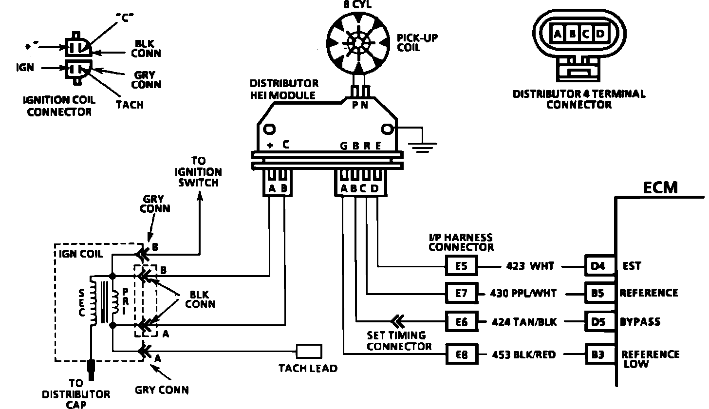 The EST distributor contains no centrifugal or vacuum advance, but instead uses a modified seven terminal High Energy Ignition (HEI) module. A four-terminal connector is used for EST use, in addition to the connectors normally found on HEI distributors. All spark timing changes are controlled by the ECM, which monitors information from the various engine sensors, computes the correct spark timing, then signals the distributor to adjust the timing accordingly. The distributor operates without ECM control during cranking or when setting basic ignition timing. This is known as the "Bypass" mode and it is determined by the bypass lead from the ECM to the distributor. When the bypass lead voltage is approximately 5.0 volts, the ECM performs the spark timing function. However, when the bypass lead is grounded or open circuited, the HEI module assumes the spark control function. Disconnecting the four terminal EST connector causes the engine to automatically operate in the bypass mode. The EST connector should be disconnected whenever setting basic ignition timing.