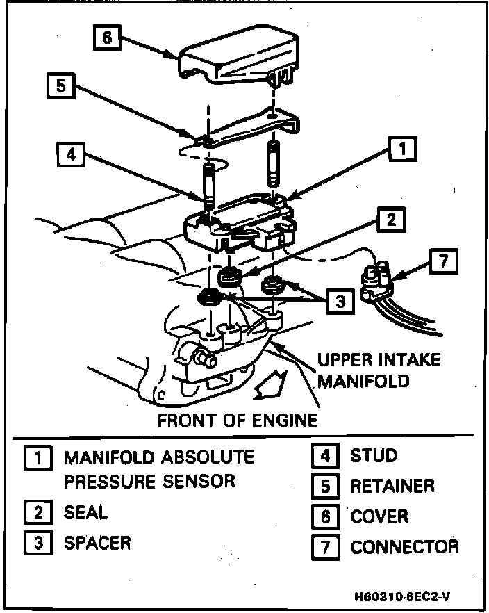 - MAP sensor to studs on upper intake manifold. Make sure seal and spacers are properly positioned.