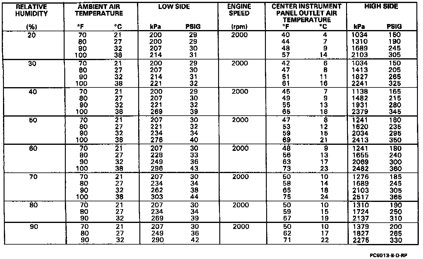 Just before making the Performance Test, the temperature and relative humidity of the ambient air (the air being blown against the condenser assembly) should be determined. Then the temperature of the air being discharged from a center instrument panel outlet should be measured with J 6742-03 or equivalent and the low-pressure gage and high-pressure gage of J 23575-01 should be read. Record the readings and compare them to the data shown in the chart.