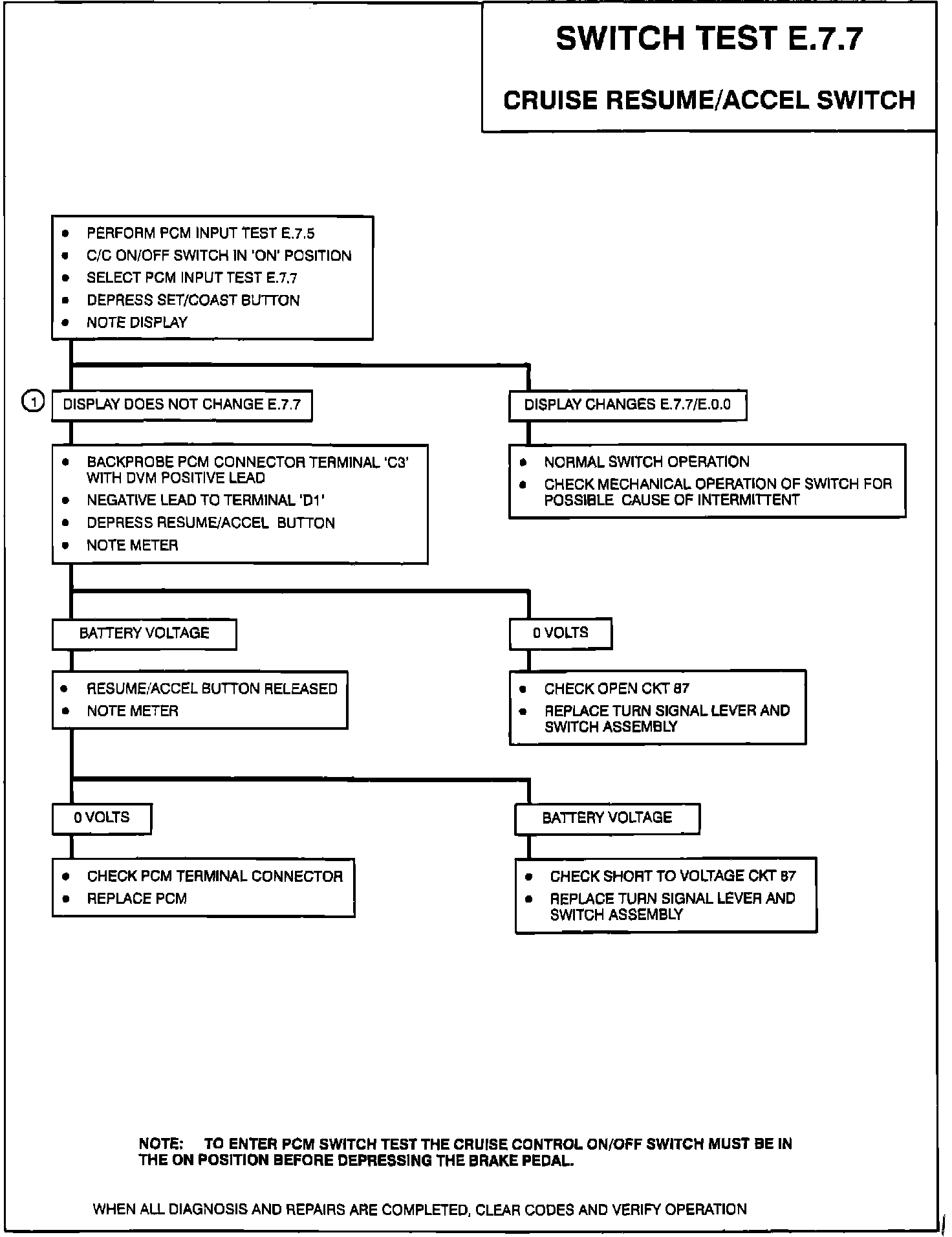 NOTE: The cruise switch must be on to perform this test. Switch test E.7.5 should be performed before this test to ensure power to the resume-accel switch.