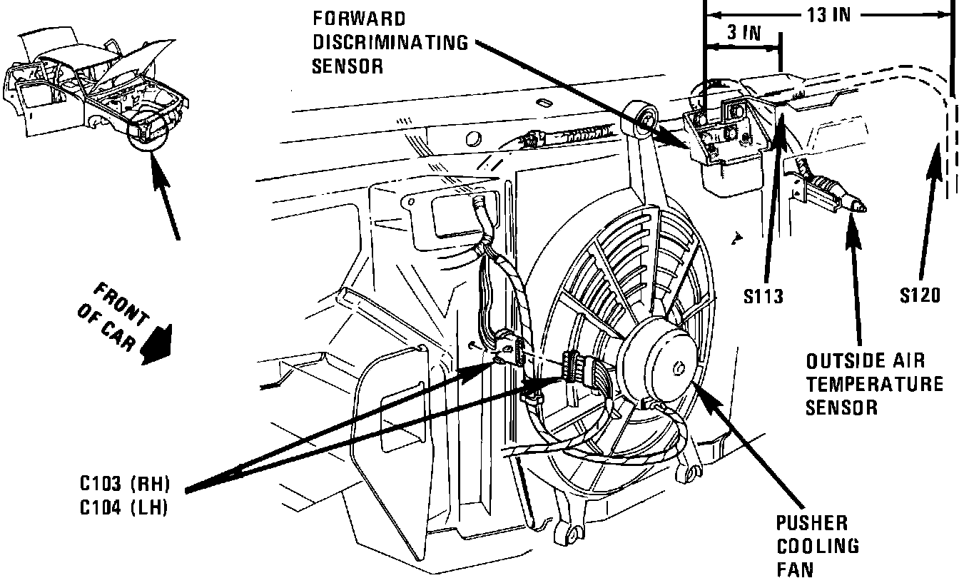 Body main harness, on radiator support, 10 inches left of Outside Air Temperature Sensor breakout