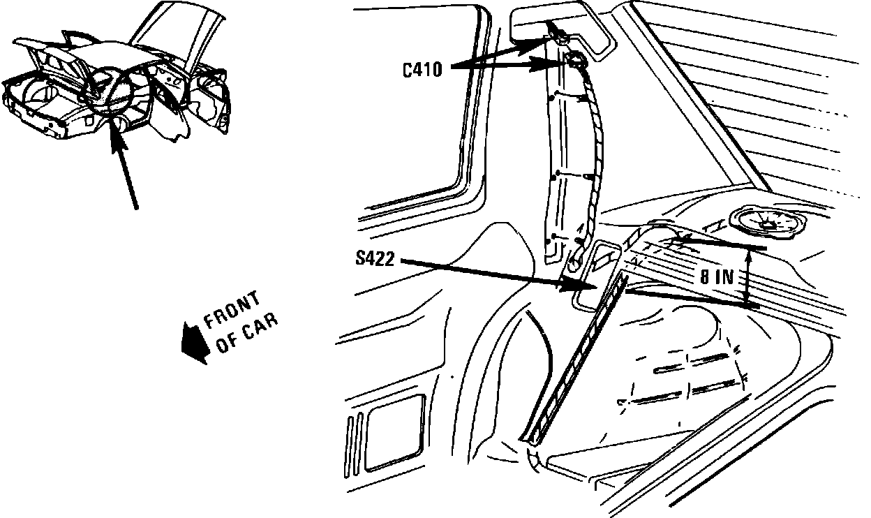 Body main harness, behind top corner of RH rear seat, 8 inches forward of C410 breakout