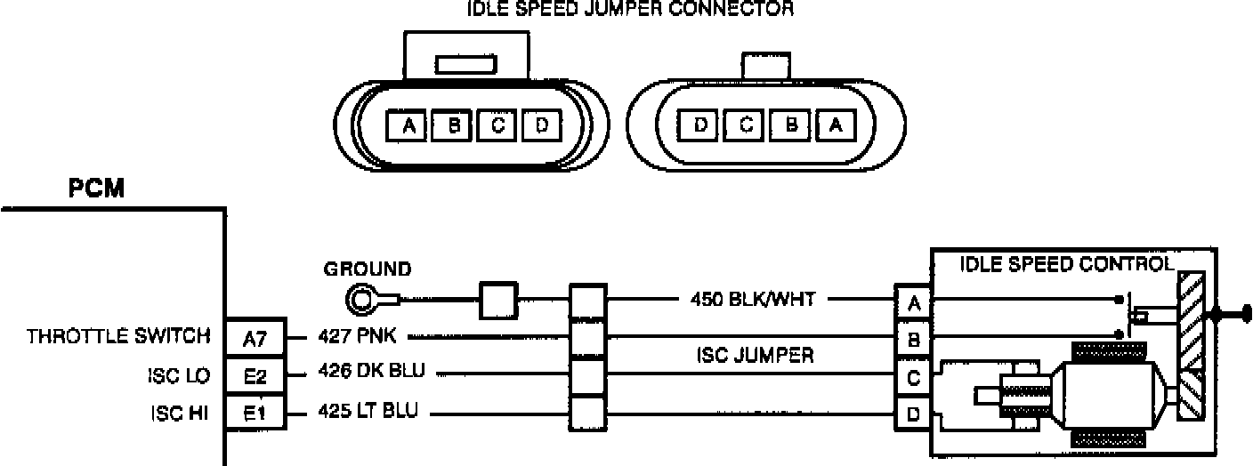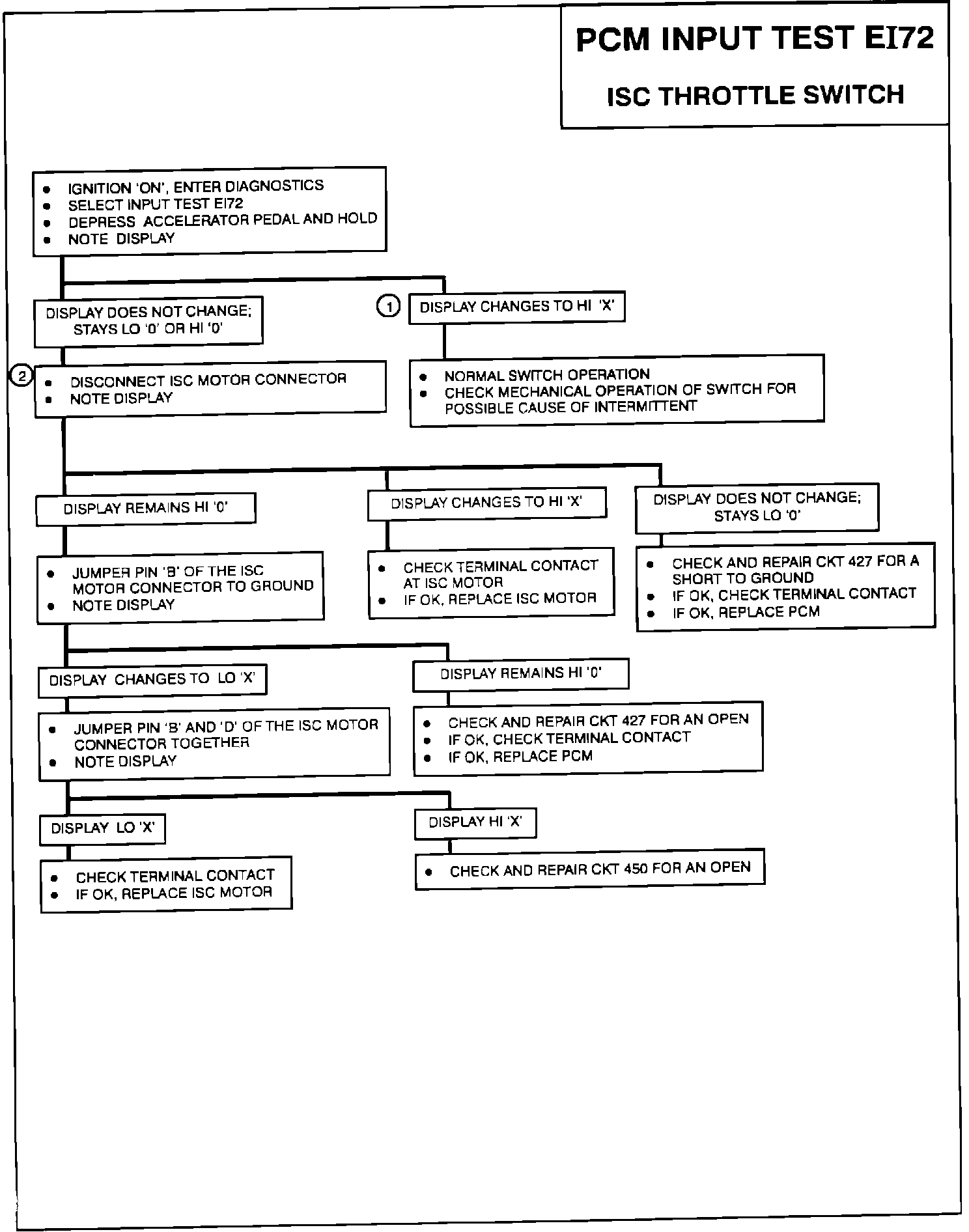 2. If the display remains LO '0', CKT 427 is shorted to ground or the PCM is bad. If the display changes to HI 'X', the ISC motor is bad. If the display remains HI '0', CKT 427 or CKT 450 is open.