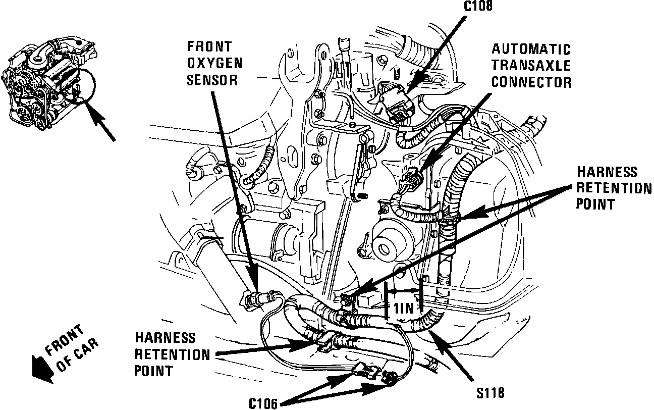 Engine harness, lower LH front of engine, 1 inch right of Front Oxygen Sensor breakout