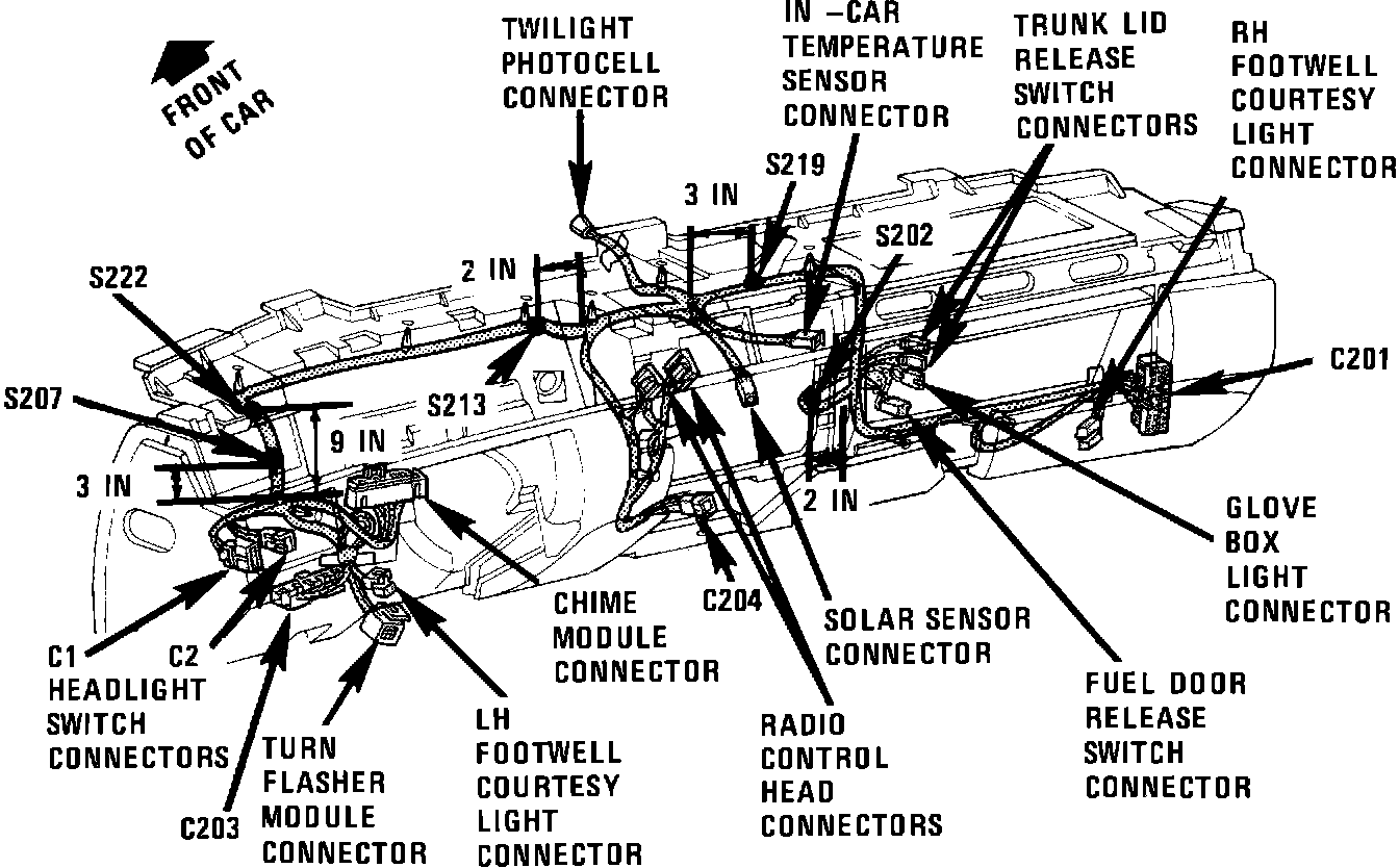 I/P harness, behind LH side of I/P, 3 inches right of headlight switch branch