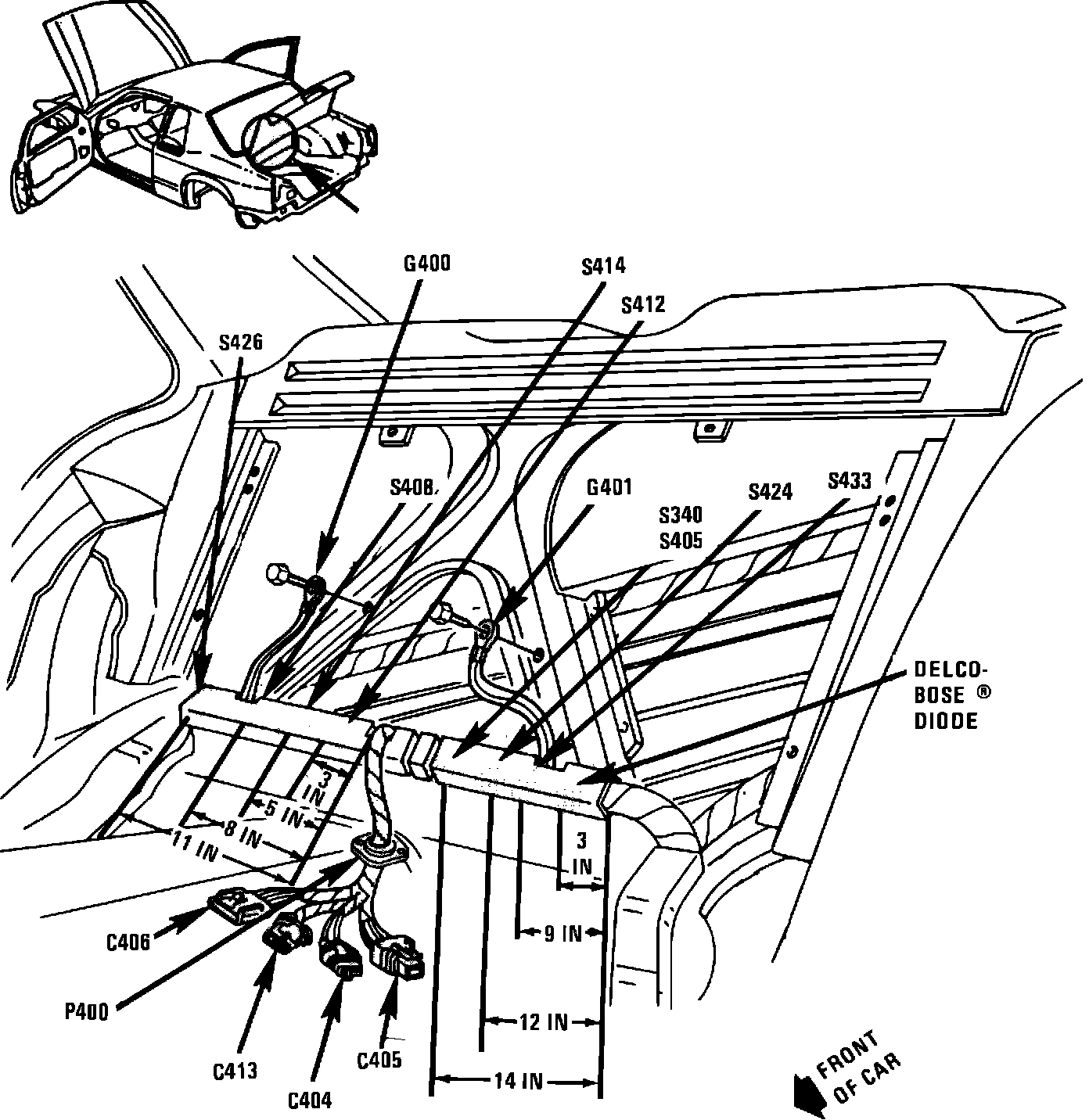 Body main harness, under LH rear seat, 14 inches left of RH edge of seat back channel