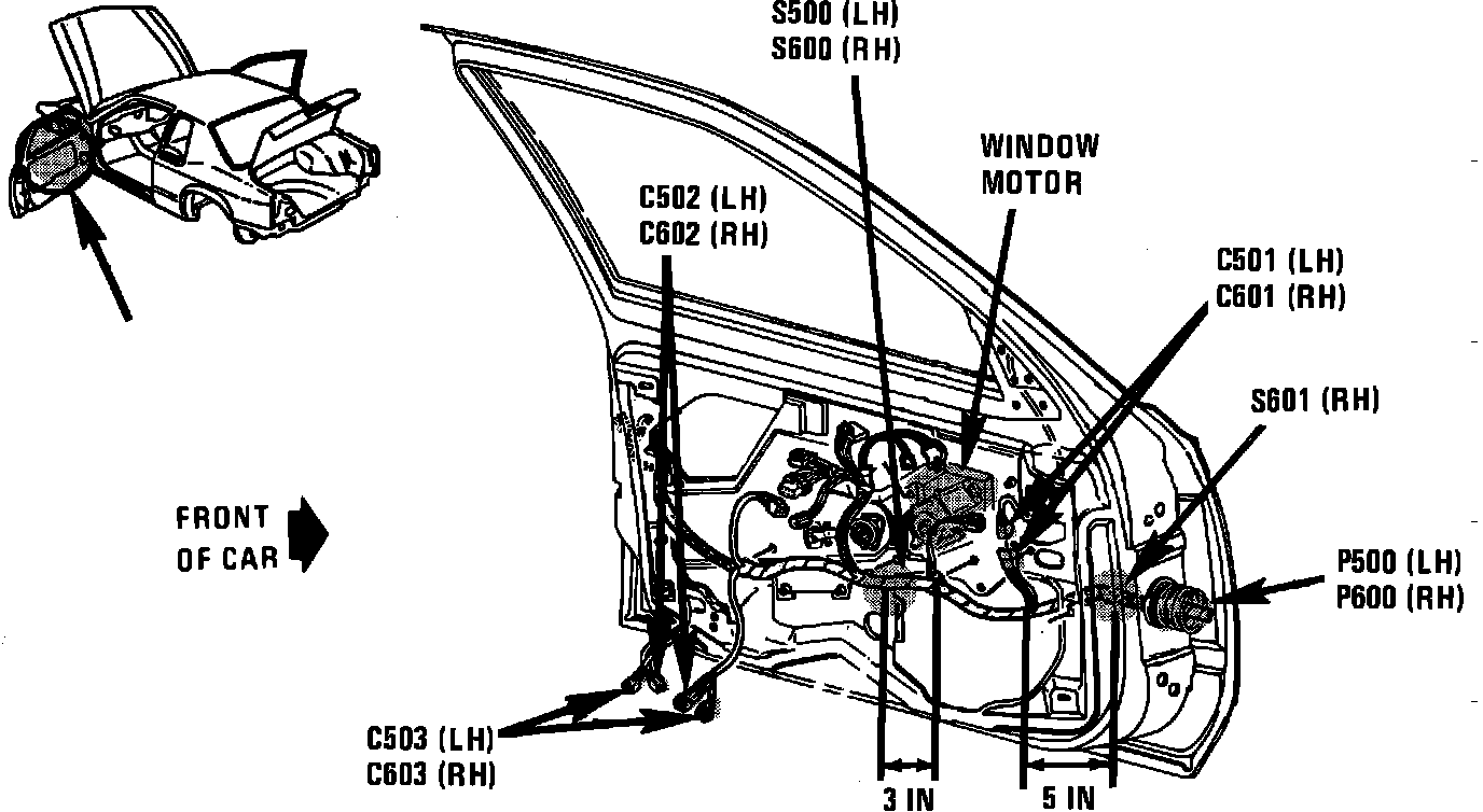Body main harness, in RH front door, 3 inches rearward of Window Motor breakout